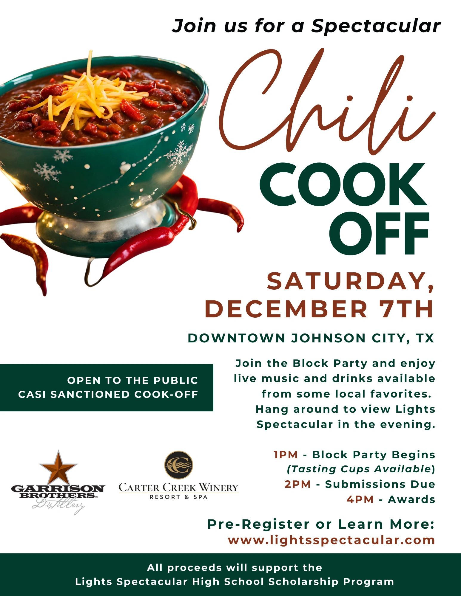 We're hosting a Block Party with delicious chili, live music, and drinks available from some of your local favorites! The block party kicks off at 1:00 pm with tasting cups available to everyone by donation. All proceeds will support he Lights Spectacular High School Scholarship Program. Awards will be shared at 5:00 PM.